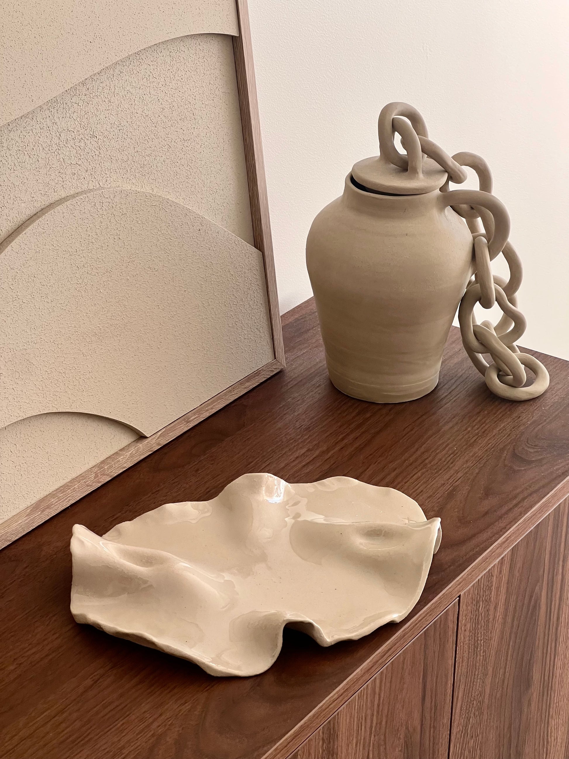 Cette nouvelle collection de plateaux en grès célèbre la singularité et l’authenticité de la matière. Chaque pièce est façonnée de manière unique, laissant le geste et la terre s’exprimer librement. Les formes organiques, aux lignes ondulées et naturelles, évoquent le mouvement des vagues et rendent chaque plateau absolument unique.