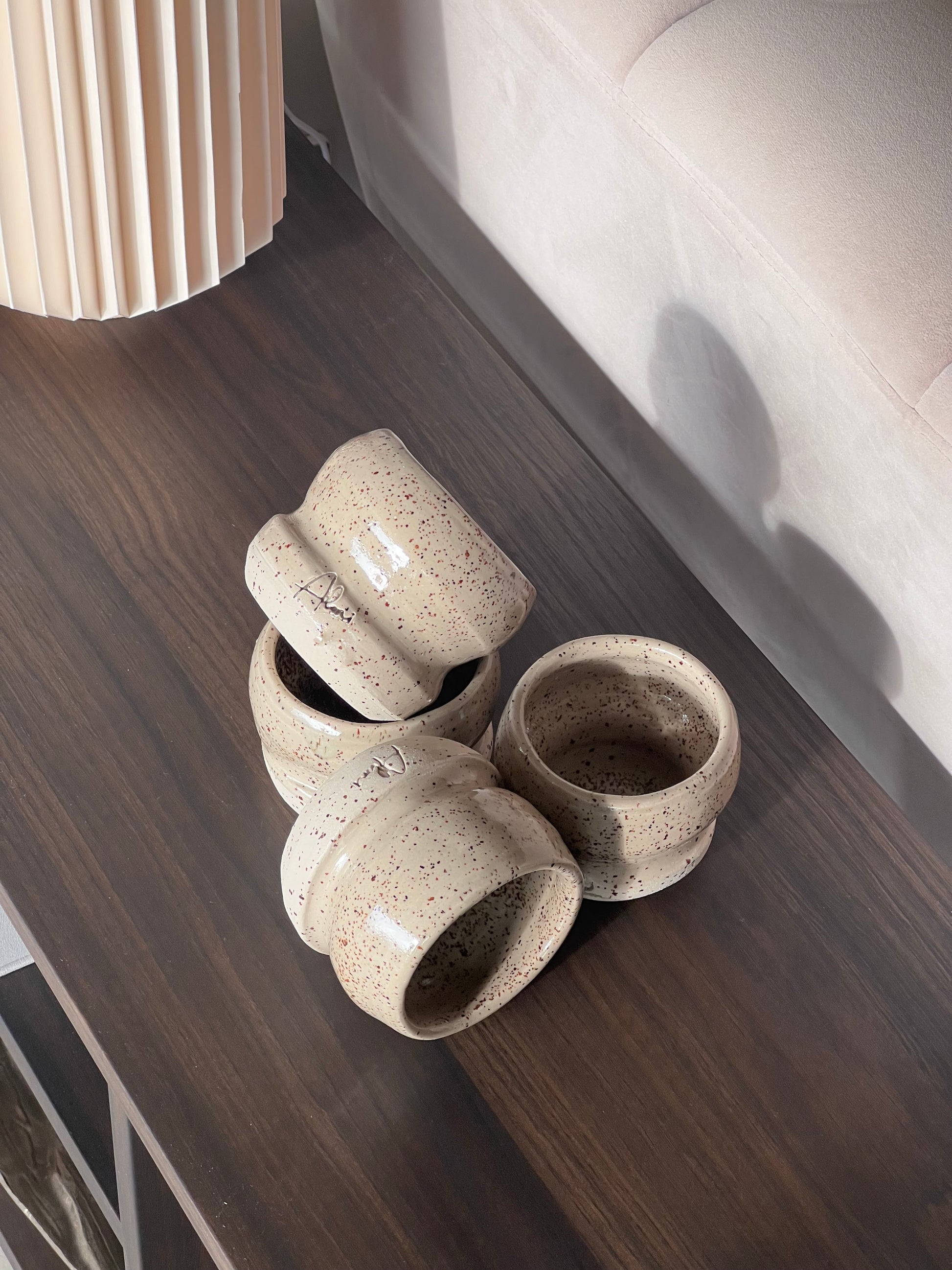 Tasse à café réalisée au tour de potier en grés, émaillée couleur beige moucheté